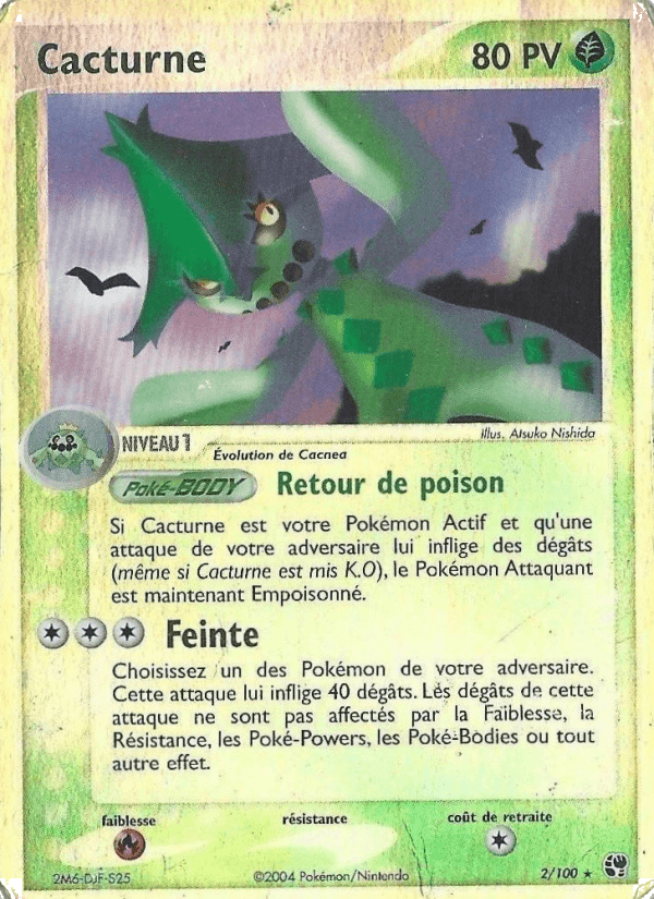 Pendant la journée, Cacturne reste immobile pour éviter de se déshydrater sous le soleil du désert. Ce Pokémon ne commence son activité qu’une fois la nuit tombée, sous une température plus fraîche.