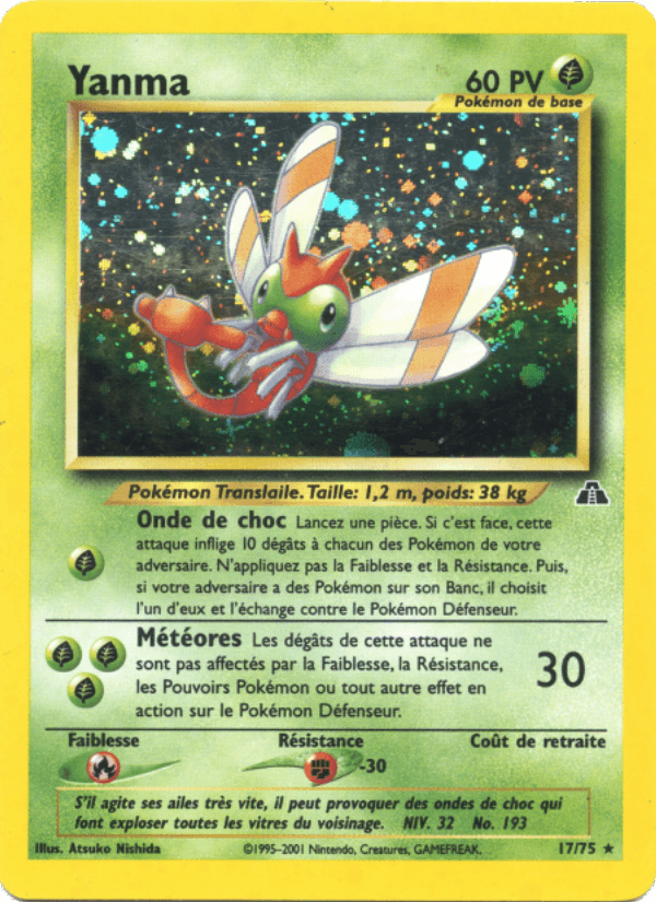 Yanma a un champ de vision de 360 degrés sans avoir besoin de bouger les yeux. Il vole incroyablement bien et peut faire des figures acrobatiques. Ce Pokémon descend en piqué sur ses proies.