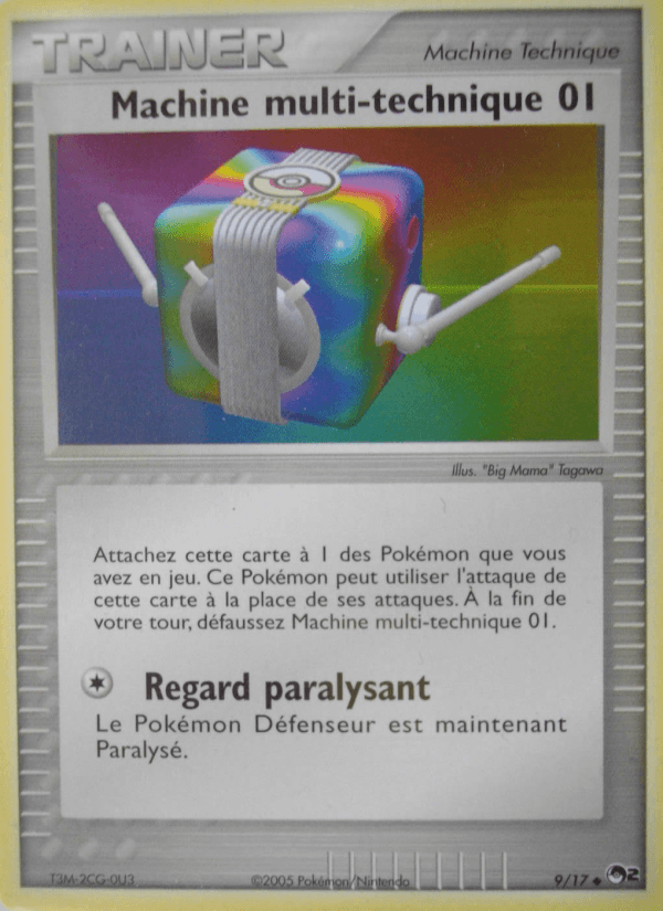 Attachez cette carte à 1 des Pokémon que vous avez en jeu. Ce Pokémon peut utiliser l'attaque de cette carte à la place de ses attaques. À la fin de votre tour, défaussez Machine multi-technique 01.